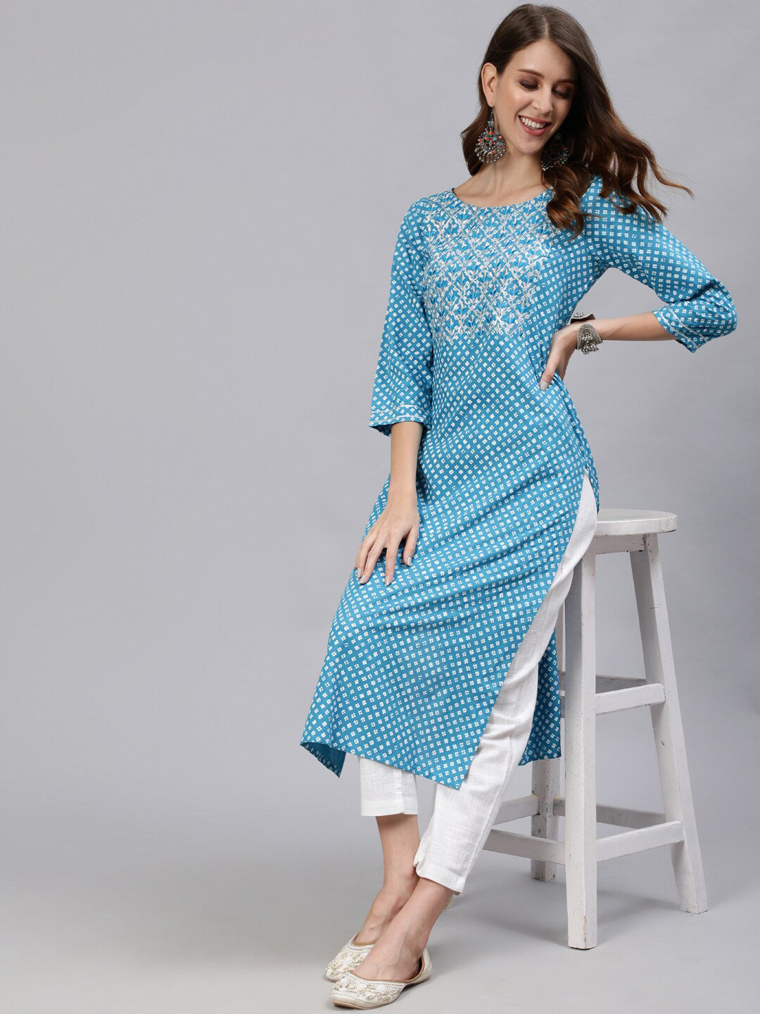 Jaipur Kurti Blue & White Floral Printed Women Kurta Product Details Colour: blue and white Floral printed Round neck Three-quarter, regul...