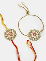 NVR Women & Men Set of 2 Gold Kundan-Studded Bhaiya Bhabhi Rakhi Set With Roli Chawal & Chocolate