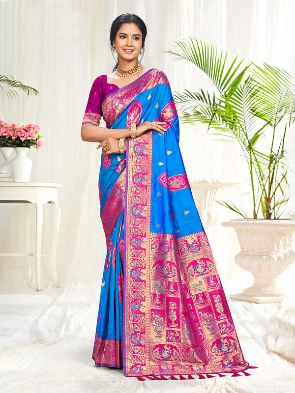 Sangam Prints Blue Silk Woven Work Traditional Saree - Free Size