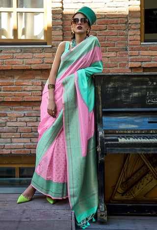 Monjolika Fashion Pink And Sea Green Weaving Silk Ceremonial Trendy Saree