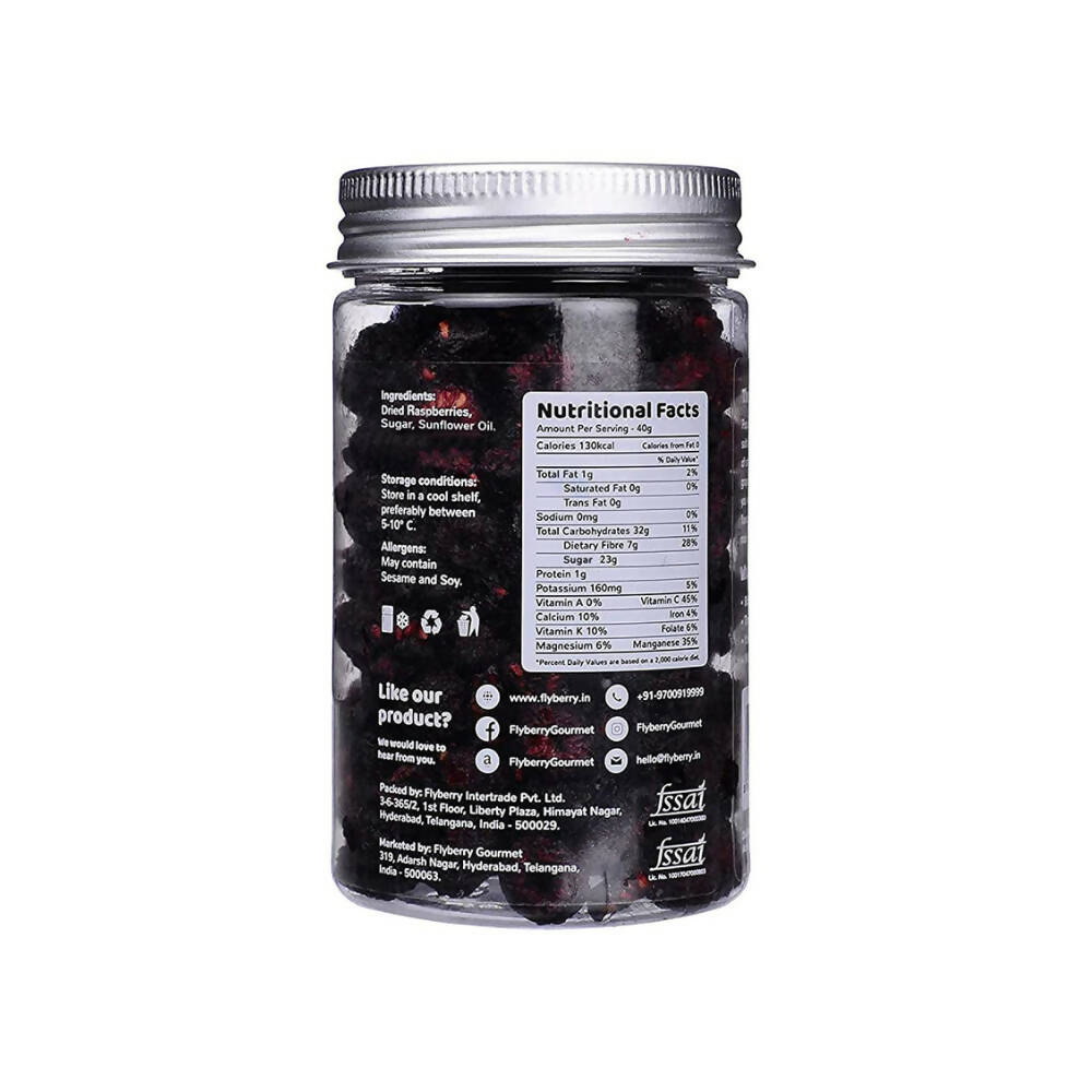 • Flyberry Dried Raspberries have their water content removed through specialized dryers and dehydrators. They are hygienically packed in a facility meeting food safety standards. In addition to vitamin C, raspberries have plenty of antioxidants.