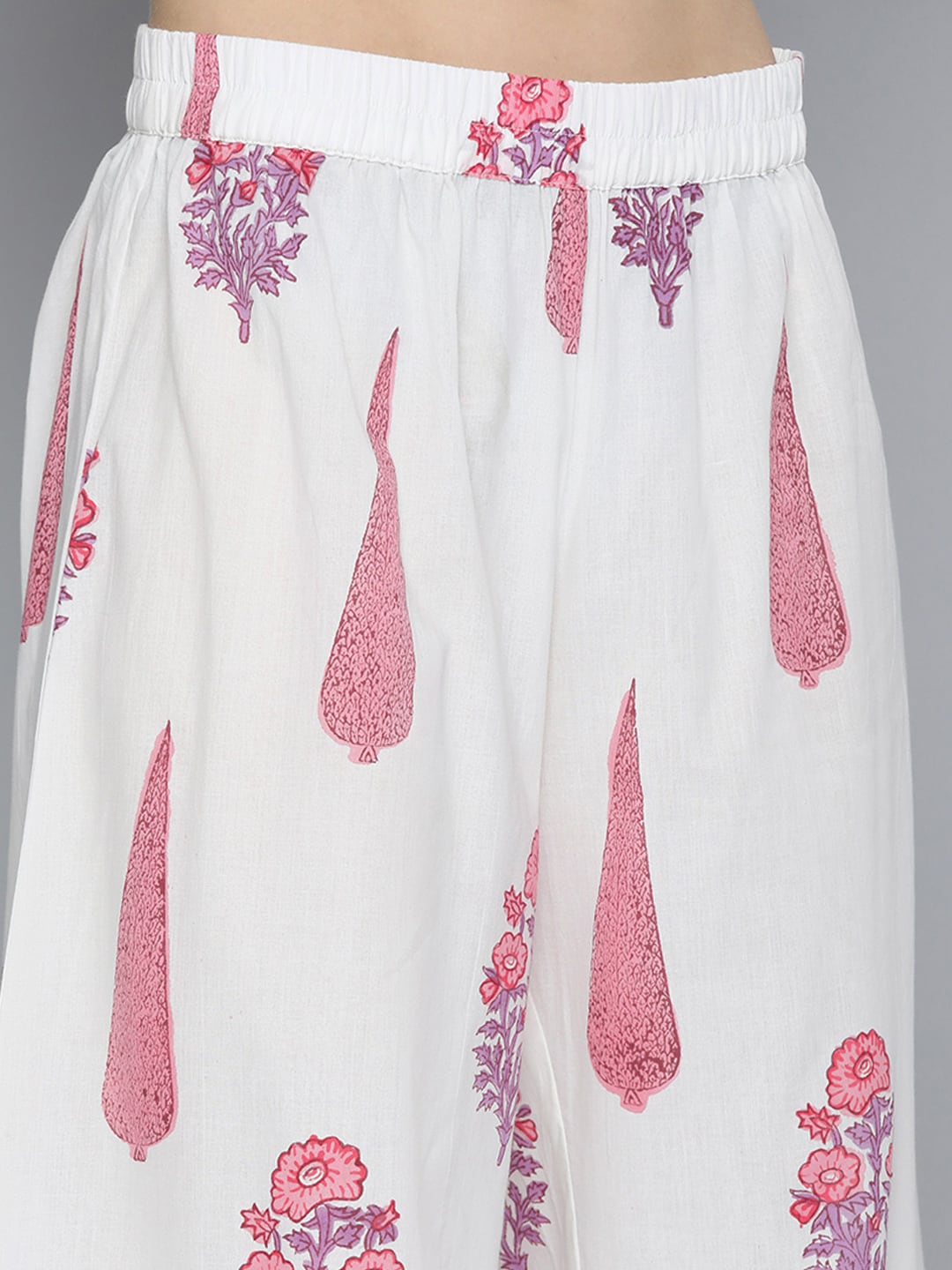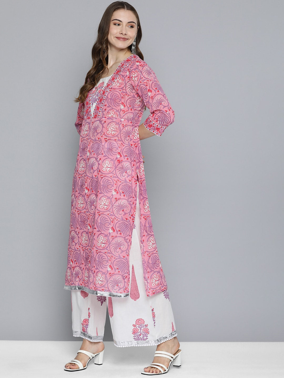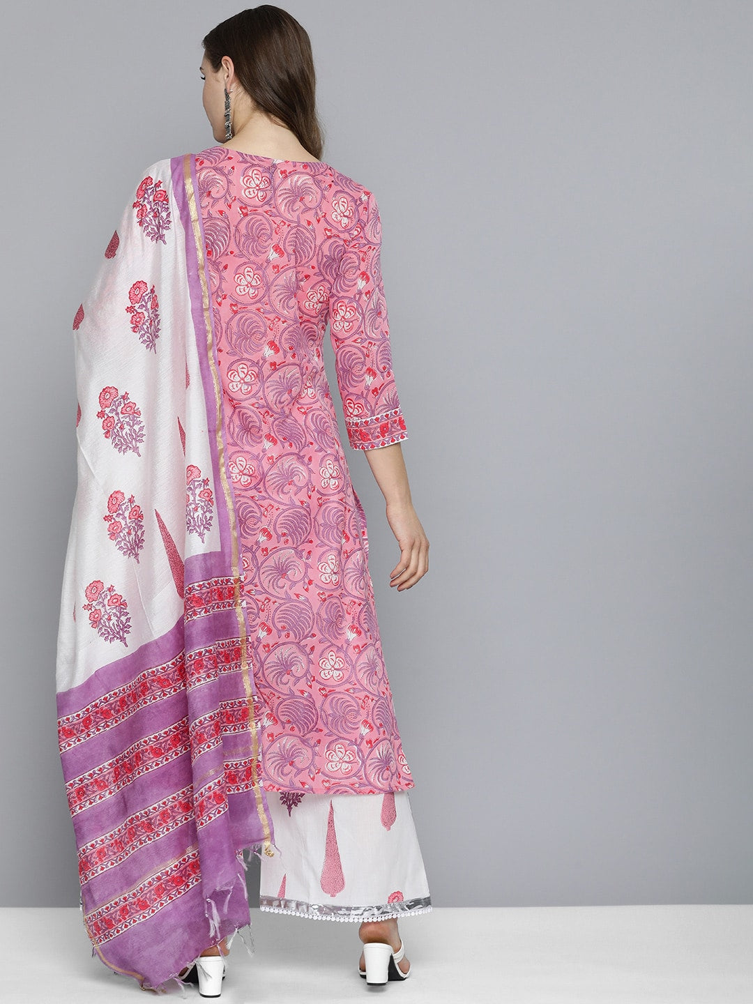 HERE&NOW Women Floral Printed Regular Pure Cotton Kurta with Palazzos & With Dupatta Product Details Pink printed Kurta with Palazzos wi...