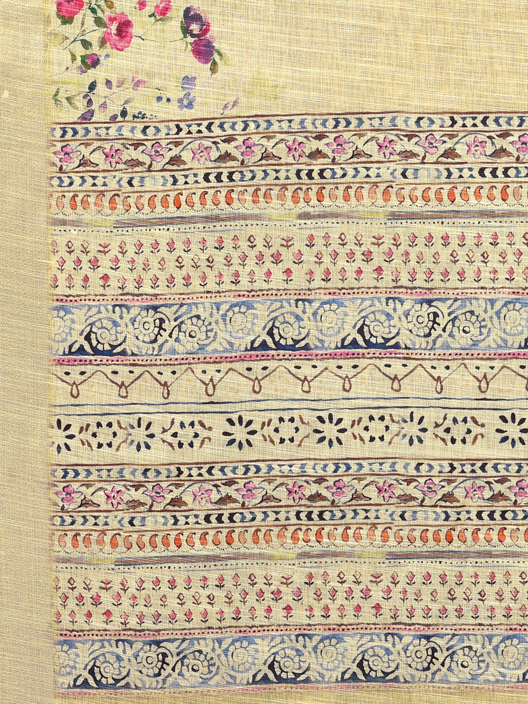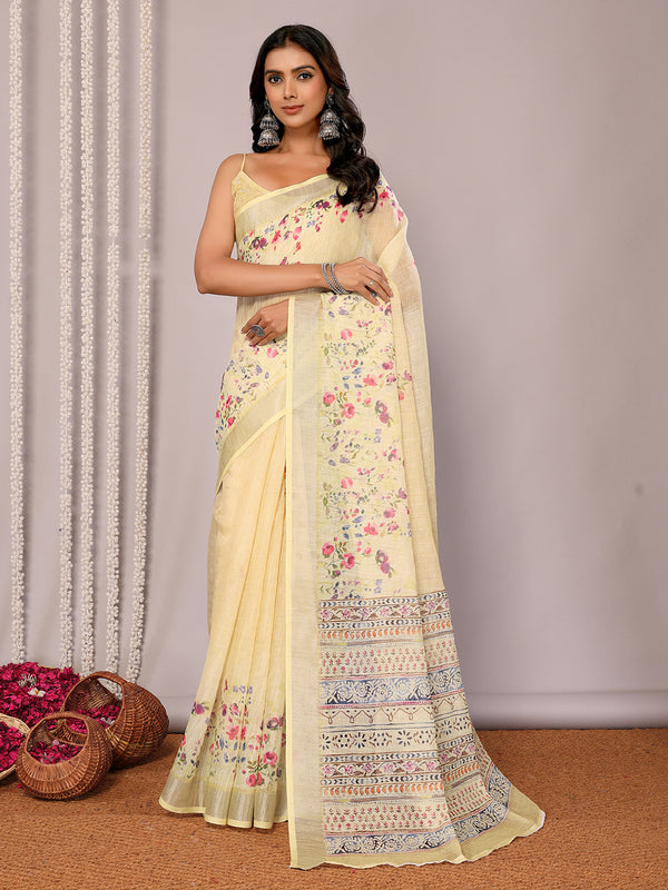 Janasya Light Yellow Cotton Linen Floral Printed SareeAbout the Product: Saree Color: Light Yellow Saree Fabric: Cotton Linen Saree Pattern: Flo...