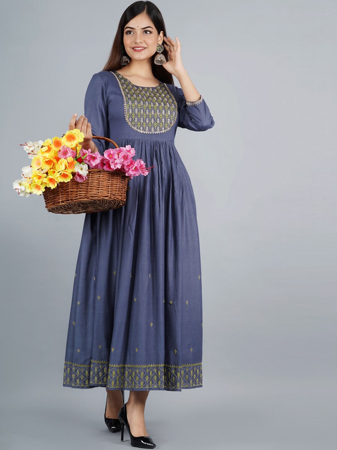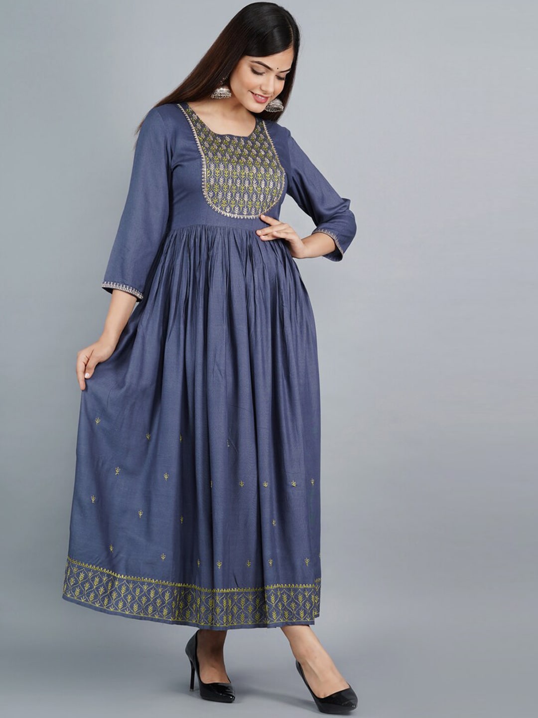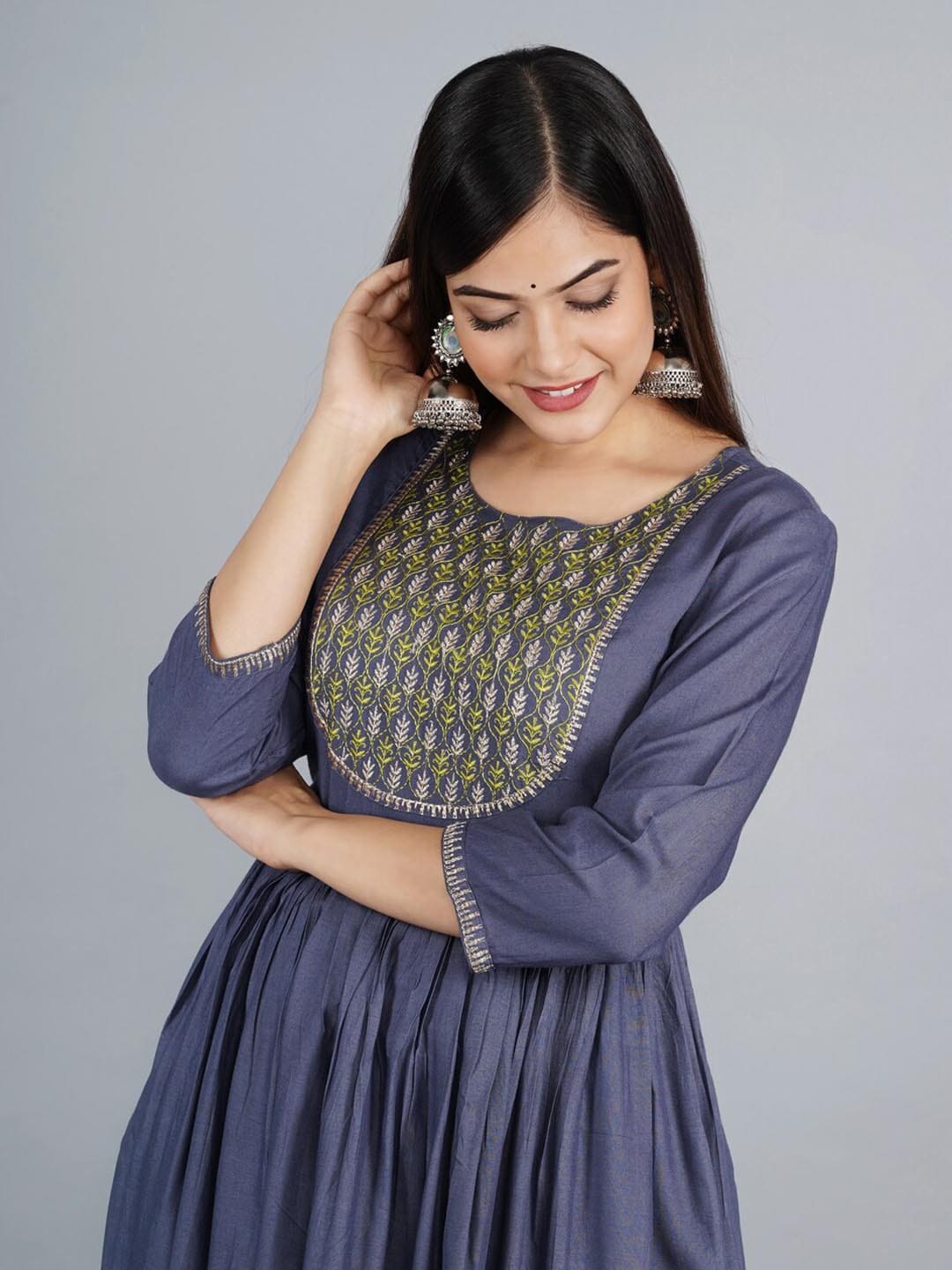 Kalini Women Grey Embroidered Anarkali Kurta Product Details Colour: grey Embroidered Round neck Three-quarter, regular sleeves Anarkali shape ...