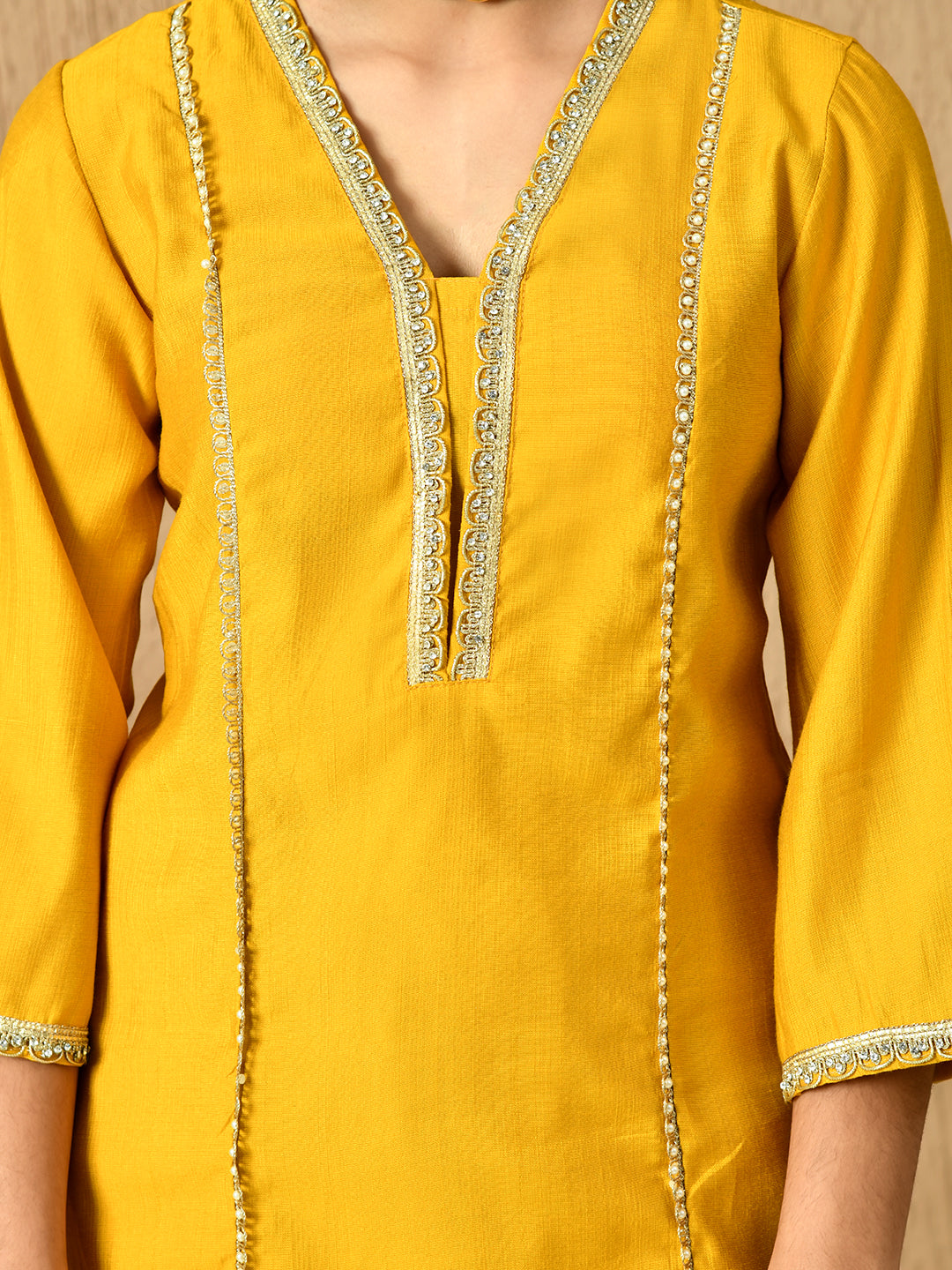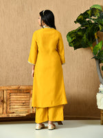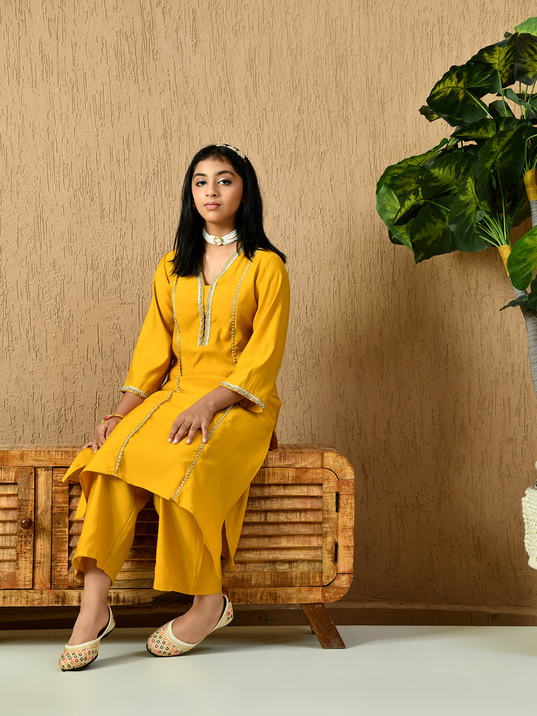 Myshka Kids Girls Calf length Embellished Kurta Set Mustard Color Pack Contains: Package-1 Kurta, 1 Trouser Shape: A-Line Fabric: Silk Color: ...
