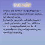 Enhance and maintain your post-facial glow with a range of professional skincare solutions by Nature's Essence. The facialist range is formulated with potent active ingredients that work deep within the skin to prolong the effect of your facial treatment by repairing and rejuvenating your natural glow every day. Create your personalized skincare ritual with a new expert range of serums and creams.