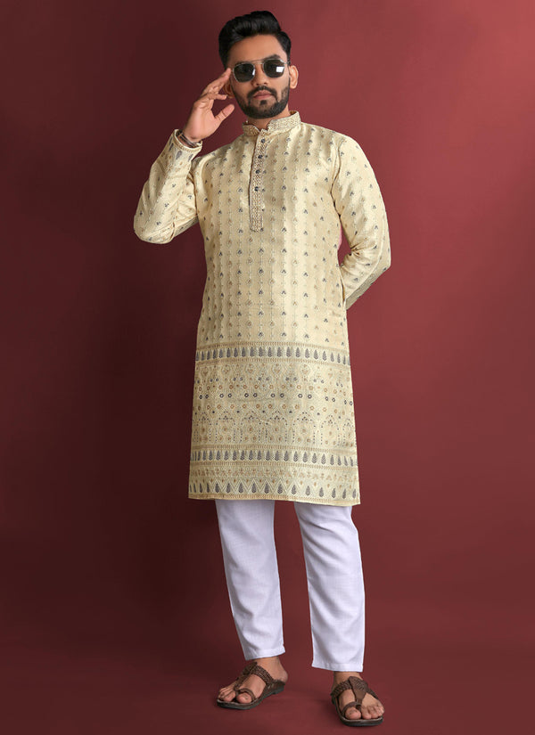 Prazu Fashion Cream Jacquard Silk Amboj Work Kurta