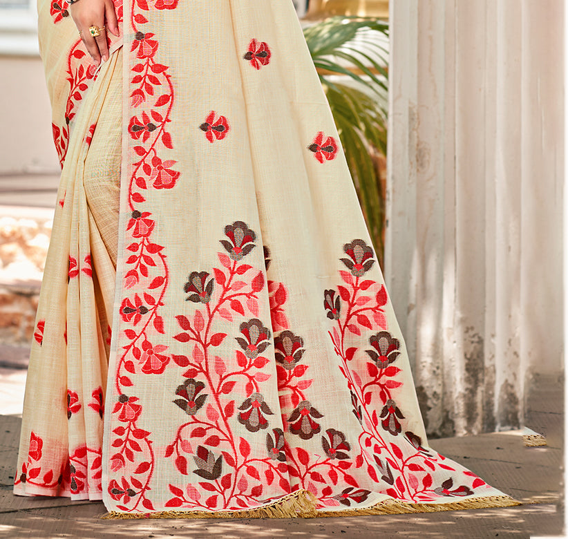 Sangam Prints Cream  Linen Woven Work Traditional Saree About the product:SANGAM PRINTS brings to you this saree which is made from Linen fabric an...