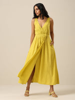 • Slub sleeveless wrap dress with hook closure and gathers around the waist and pockets on both the side for relaxed summer look.