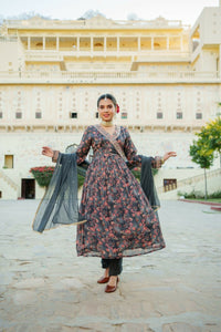 Vaasva Black Chinon Floral Embroidered Angrakha, Pant & Dupatta set