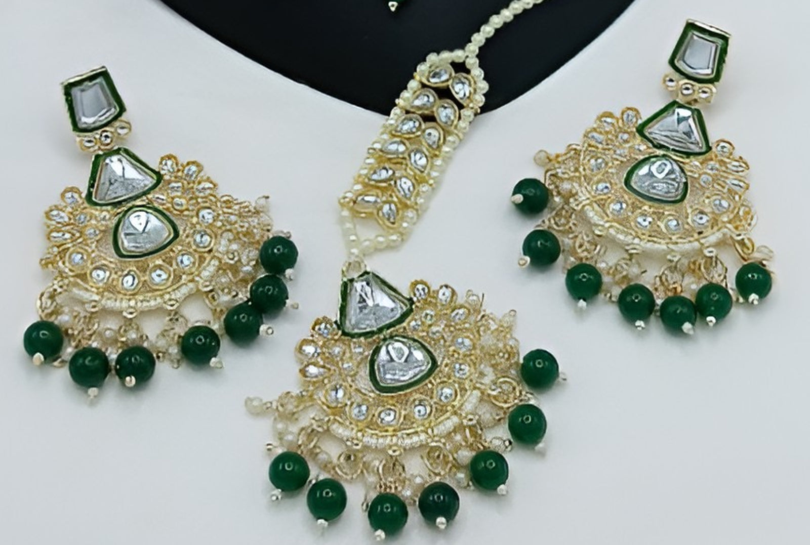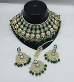 Jewel City Kundan Choker Set with Pearl Tassels - Premium Glass Cut Stone Wedding Collection Color: Green Material: Alloy Elevate your bridal loo...