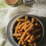 Crunch into Murukulu, a South Indian favorite made from rice flour and seasoned with sesame and cumin seeds, ideal for those who love a crispy bite.