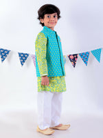 Lil Drama Jaipur Print Stylish Cotton Kurta with Pyjama and Jacket Set for Boys - Green
