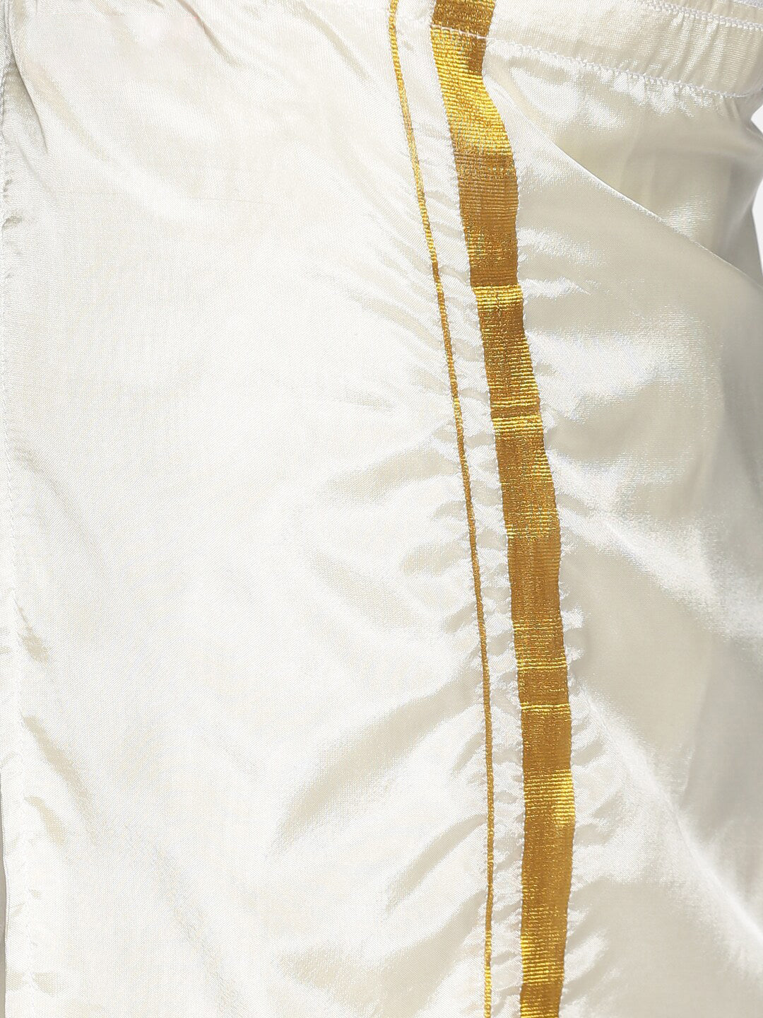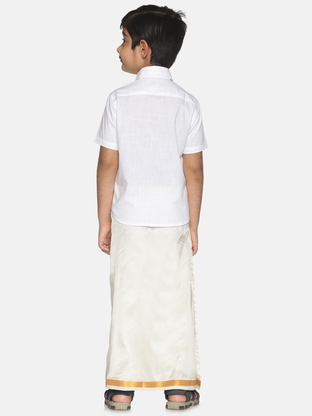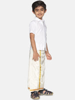 Sethukrishna Boys White & Gold-Toned Pure Cotton Shirt with Dhoti Set