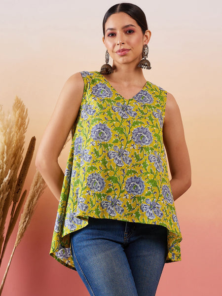 Look spick and span by dolling up yourself in this sunset yellow floral printed Sleeveless top. This blouse can be paired with dark denim and hoops.