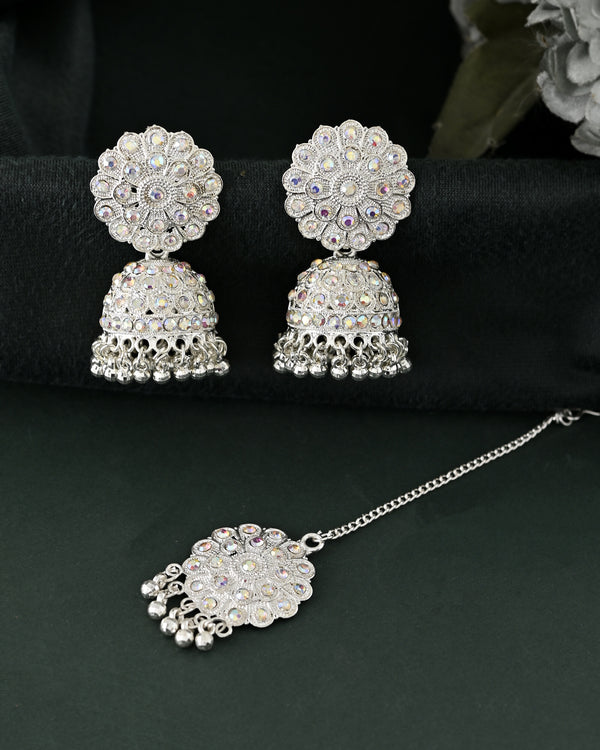 VOJ White Stone Studded Jhumkar Earrings With Maang Tikka - Distacart