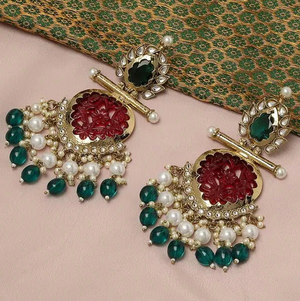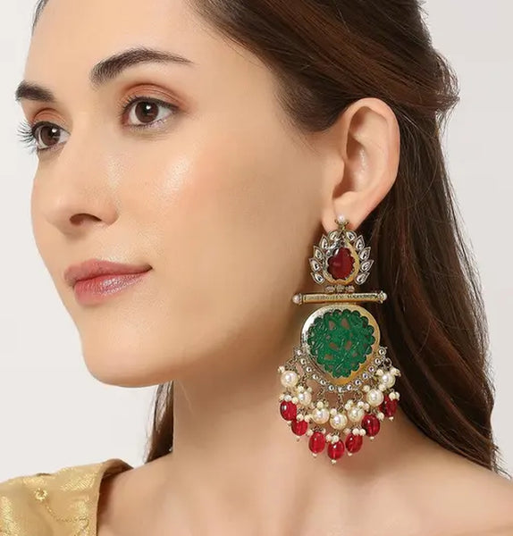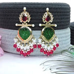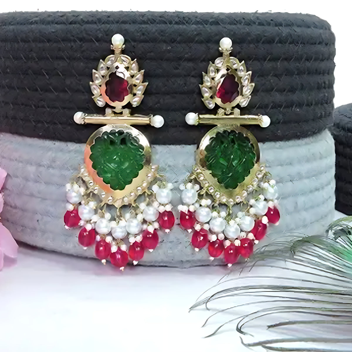 These stunning earrings blend traditional Indian jewelry aesthetics with contemporary elegance. The combination of rich green and vibrant red gemstones creates a regal look, while the dangling pearls add movement and sophistication. Elevate your style with these eye-catching, luxurious accessories that are sure to turn heads.