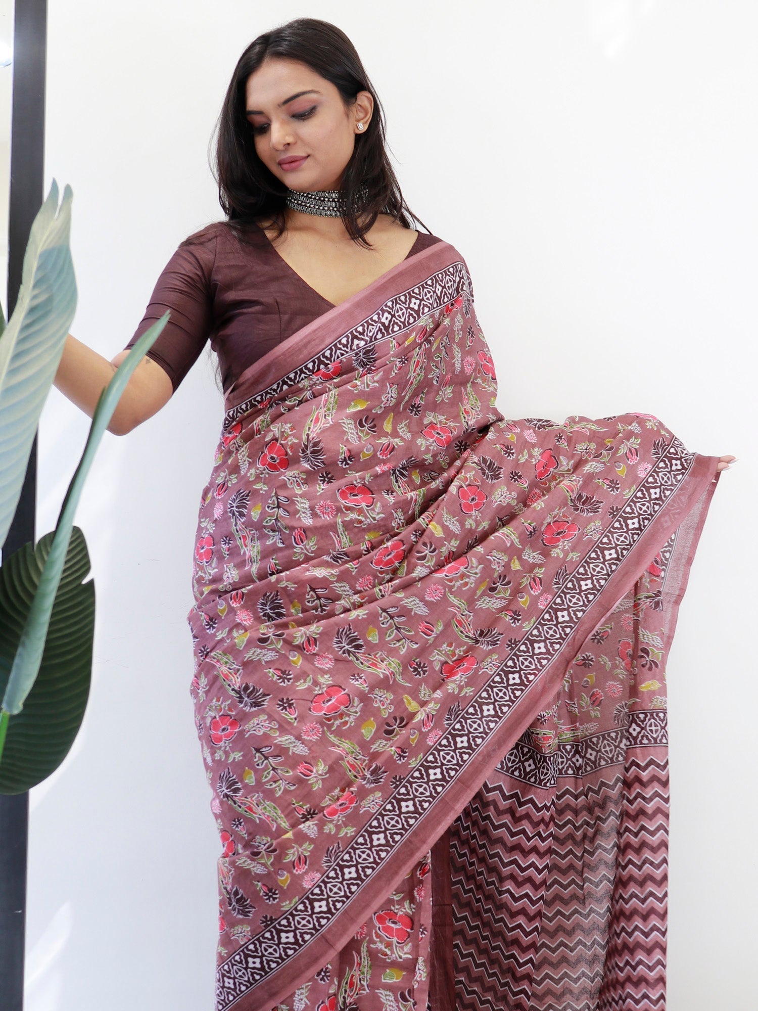 NOZ2TOZ Women's Cotton Brown Printed Ready to Wear With Blouse PieceDESCRIPTION This saree is made from Cotton and is Brown in color. Our Ethnic Sa...