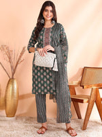 Ode by House of Pataudi Printed Mirror Work Pure Cotton Kurta With Trousers & Dupatta Product Details Green, white & red printed Kurta w...