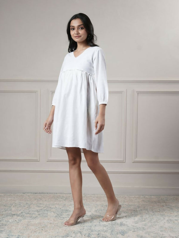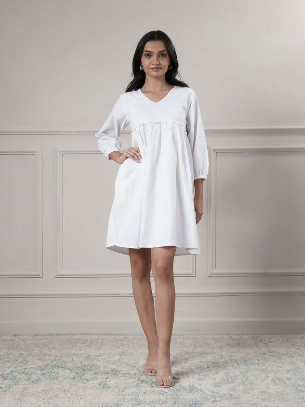 Joban Fashion Women's White Short DressAbout the Product: No. of Components: 1 Nature of Embroidery: Plain Neck: V Neck Sleeve Length: 3/4 slee...