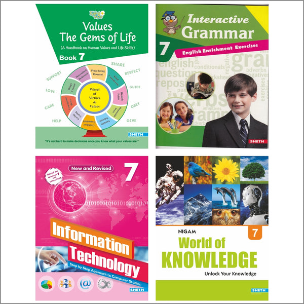 • "Sheth Publishing House brings combo books of "Nigam Information Technology, Interactive Grammar, Nigam World of Knowledge & Value Edition - Gems of Life"Information Technology is the scientific and practical approach to computation and this series has been created using the latest technology, which includes Windows 7 Operating System & Microsoft Office 2007.The Interactive Grammar Series from Senior K.G. to Standard IX will enable the students to make use of the grammatical terms in proper usage and help them to speak and write simple and correct English. This series contains a lot of puzzles and exercises in different forms to make the subject interesting and educational.Nigam World Knowledge 1 to 8 Book series will add to their existing knowledge bank. General Knowledge is an important aspect of everyone's life today. It widens the state of mind of the child. A child should be able to compete in today's unending informative and competitive world.‘Gift of Life' is a handbook on Value Education. The book provides opportunities to children to make an appraisal of themselves and to find that there is goodness in them, which needed only a little help from parents, teachers, elders, They must learn certain values which give them the sense of right and wrong, good and bad, what and when to practice, etc. This book is based on the ten special values prescribed by the Education Board of Maharashtra."