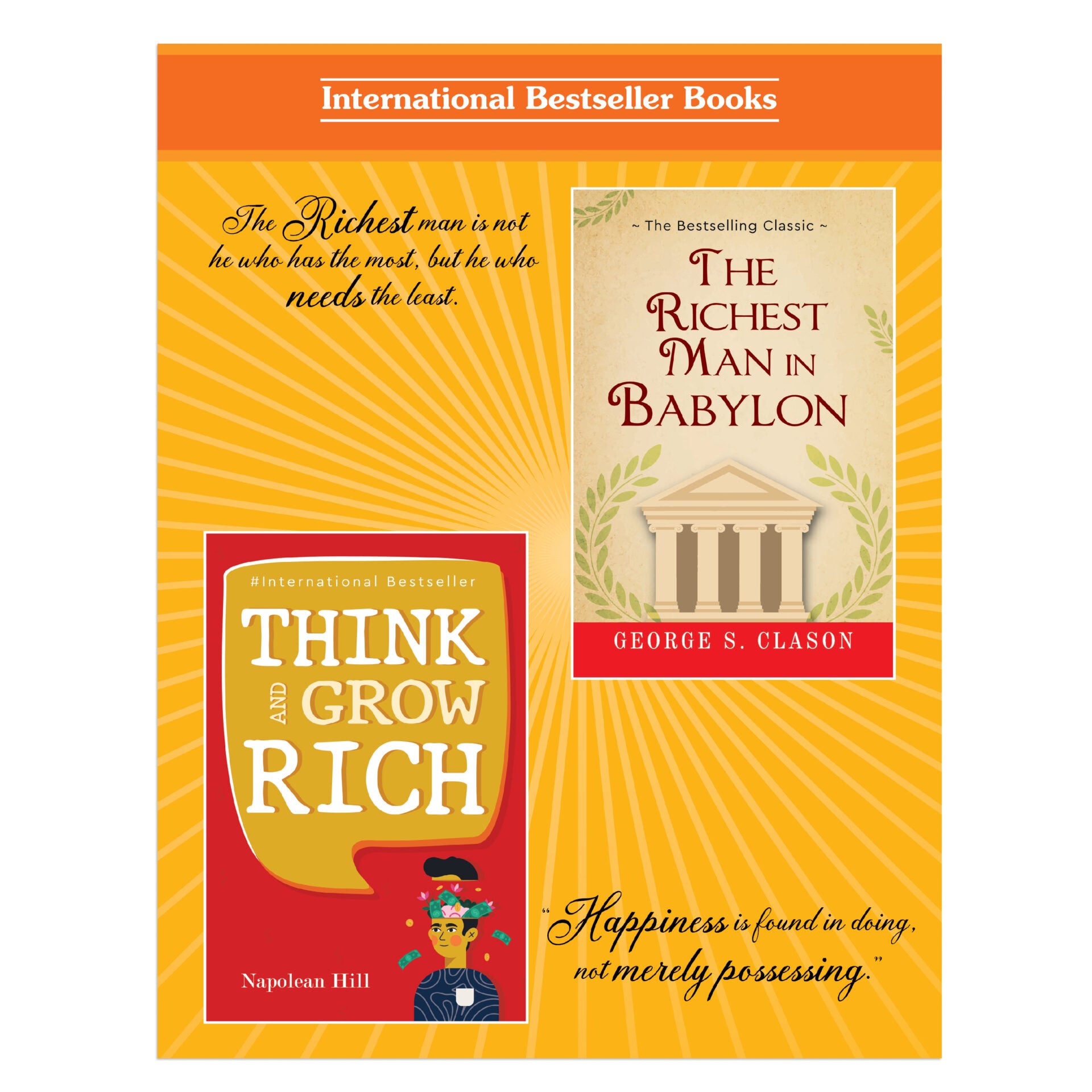 • Think and Grow Rich has been called the "Granddaddy of All Motivational Literature." It was the first book to boldly ask, "What makes a winner?" The man who asked and listened for the answer, Napoleon Hill, is now counted in the top ranks of the world's winners himself. The most famous of all teachers of success spent "a fortune and the better part of a lifetime of effort" to produce the "Law of Success" philosophy that forms the basis of his books and that is so powerfully summarized in this one. In the original Think and Grow Rich, published in 1937, Hill draws on stories of Andrew Carnegie, Thomas Edison, Henry Ford, and other millionaires of his generation to illustrate his principles. In the updated version, Arthur R. Pell, Ph.D., a nationally known author, lecturer, and consultant in human resources management and an expert in applying Hill's thought, deftly interweaves anecdotes of how contemporary millionaires and billionaires, such as Bill Gates, Mary Kay Ash, Dave Thomas, and Sir John Templeton, achieved their wealth. Outmoded or arcane terminology and examples are faithfully refreshed to preclude any stumbling blocks to a new generation of readers. The Richest Man in Babylon is a 1926 book by George S. Clason that dispenses financial advice through a collection of parables set 4,000 years ago in ancient Babylon. The book remains in print almost a century after the parables were originally published, and is regarded as a classic of personal financial advice. The original 1926 book groups the parables into general themes of advice, and particularly "The Seven Cures" and the "Five Laws of Gold". Some themes can overlap (e.g. The First Cure is similar to the First Law of Gold). A perfect guide to understanding finances with time-tested principles to gain and retain personal wealth, The Richest Man in Babylon has been inspiring readers for generations. It continues to remain a classic bestseller.