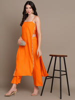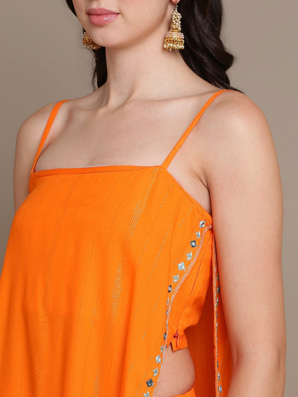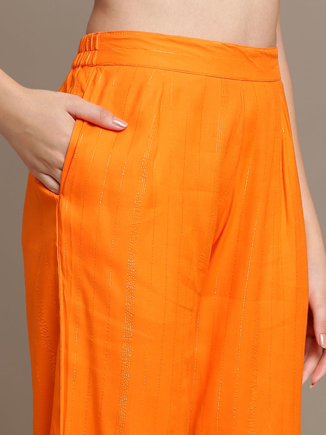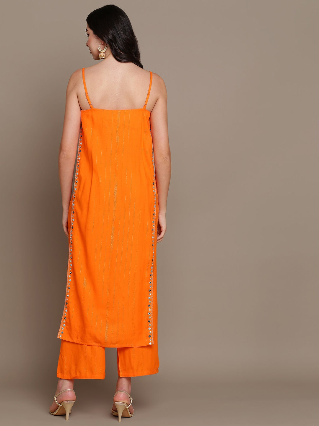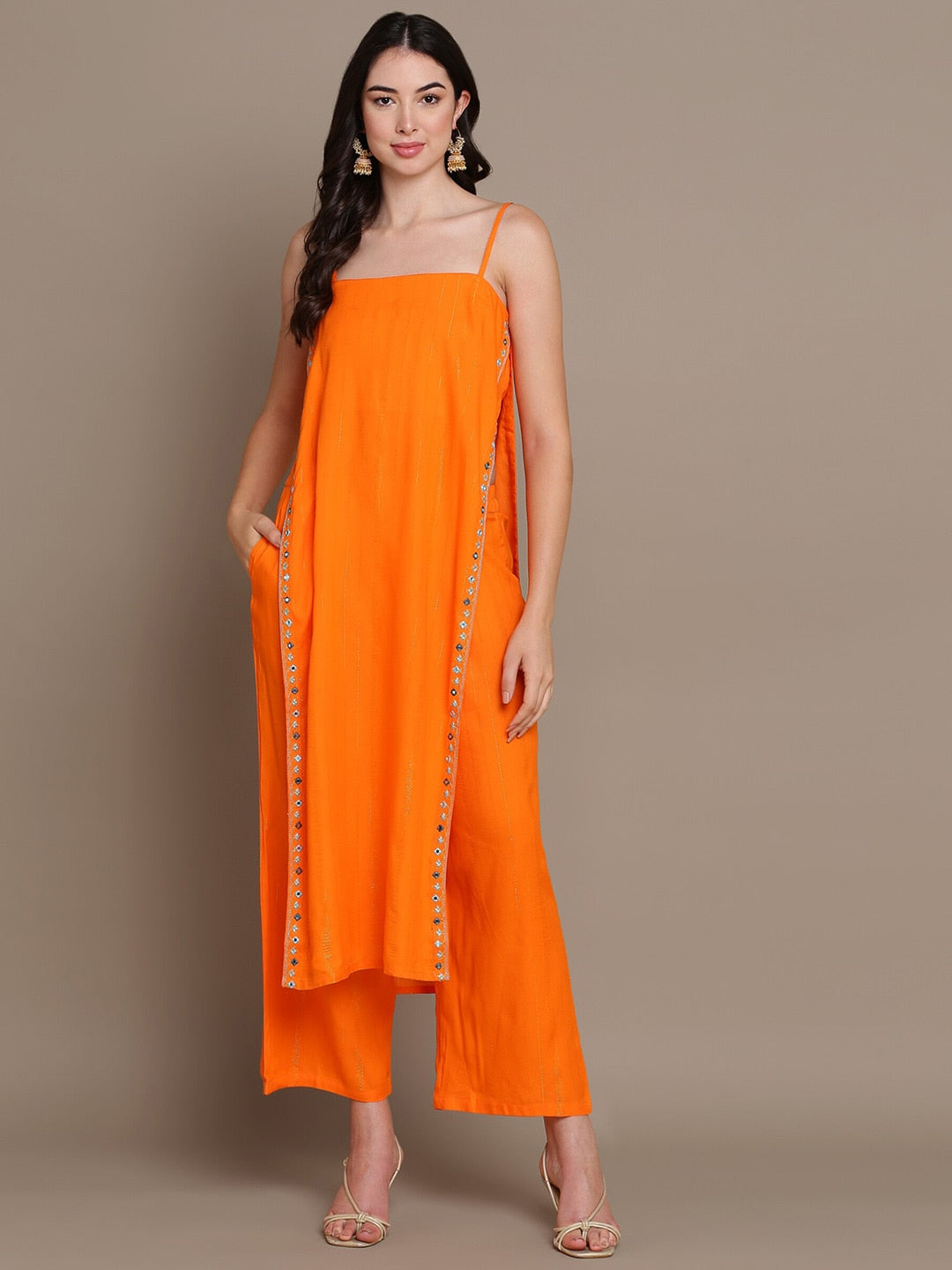 HERE&NOW Striped Mirror Work High Slit Kurta with Palazzos Product Details Orange striped Kurta with PalazzosKurta design: Striped  Straig...
