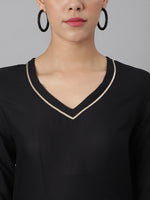 Black straight calf length kurta, has a V-neck, three-quarter sleeves, side slits