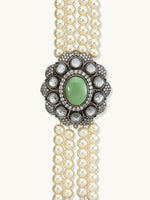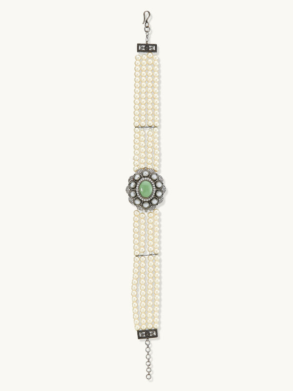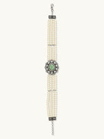 Silver-toned Floral motif, has zircon & is jade stone centric choker with pearl string details. Secured with a S-hook lock. 1 year plating warranty.