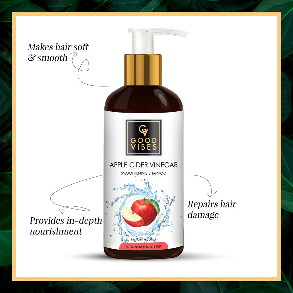 Apple Cider Vinegar is loaded with antioxidants Good Vibes Apple Cider Vinegar shampoo protects your hair from free radical damage. It is also rich in properties and essential oils which makes it extremely useful for dandruff and dry, itchy scalps. The Good Vibes Apple Cider Vinegar is overloaded with natural anti-inflammatory and antiseptic properties which maintain the scalp's pH levels. It helps keep the hair shiny and soft and the scalp clean