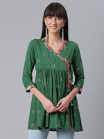 Ahalyaa Green & Pink Floral Printed TunicProduct Details:The Green and pink printed tunic, has a v-neck, three-quarter sleeves, gathers detailS...