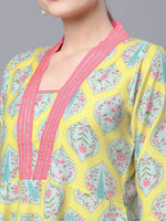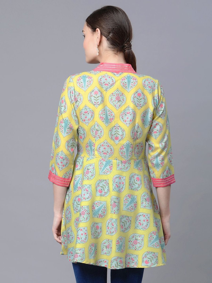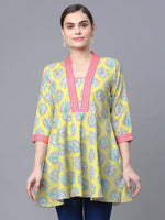 Lemon Yellow-Coloured Cotton Digital Print Tunic, has a V Neck, Three-Quarter Sleeves, flared hem, Side Pocket. Taking the bright colours of summer and nature, Ahalyaa inspires the Women of style and substance to experiment with a range of colours from sophisticated black to subtle pastels and vibrant shades. So match the shade to your personality! Mix and match from a variety of colours and prints for a feminine look, or a modern twist.