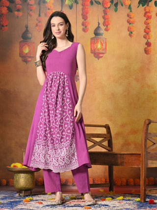 Myshka Women Rust Pure Cotton Sleeveless Schiffli Top and Flared Skirt