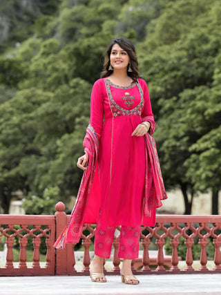 Juniper Women's Pink Thread Embroidered Viscose Kurta Palazzo And Dupatta Set With Thread & Mirror Work