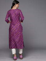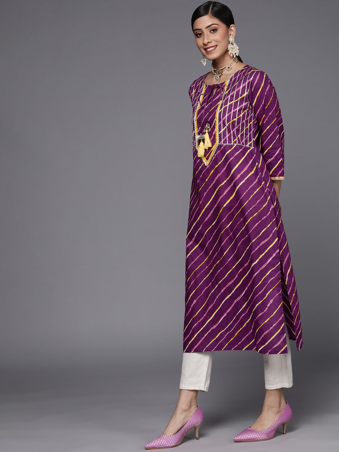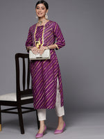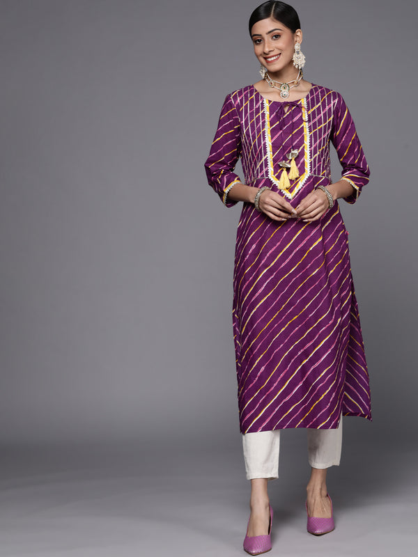 Purple cotton straight printed kurta with lace detailing, dori & tassels detailing.
