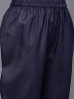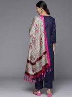 Navy Blue Yoke Embroidered Kurta Paired With Tonal Solid Bottom And Printed Dupatta Kurta With Round Neck And Three Quarter Sleeves, Straight Kurta With Side Slits