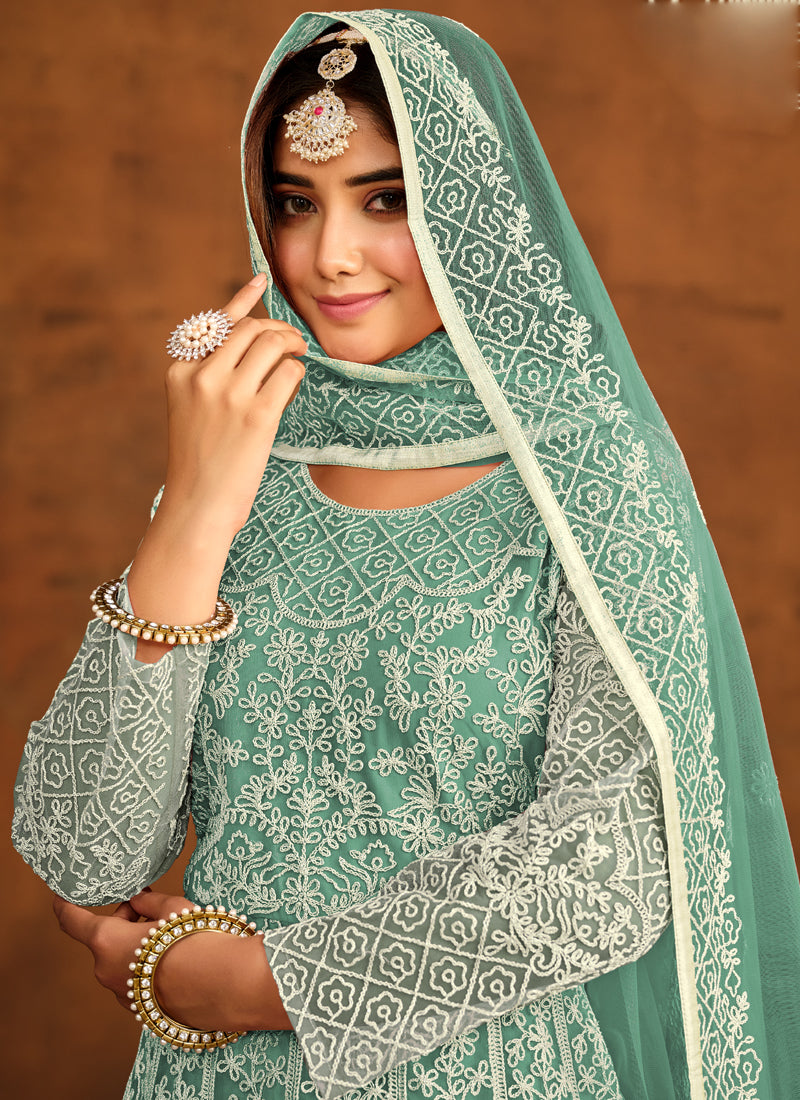 Vegaa Fashion Designer Bottel Green Net Embroidery Anarkali Suit - S