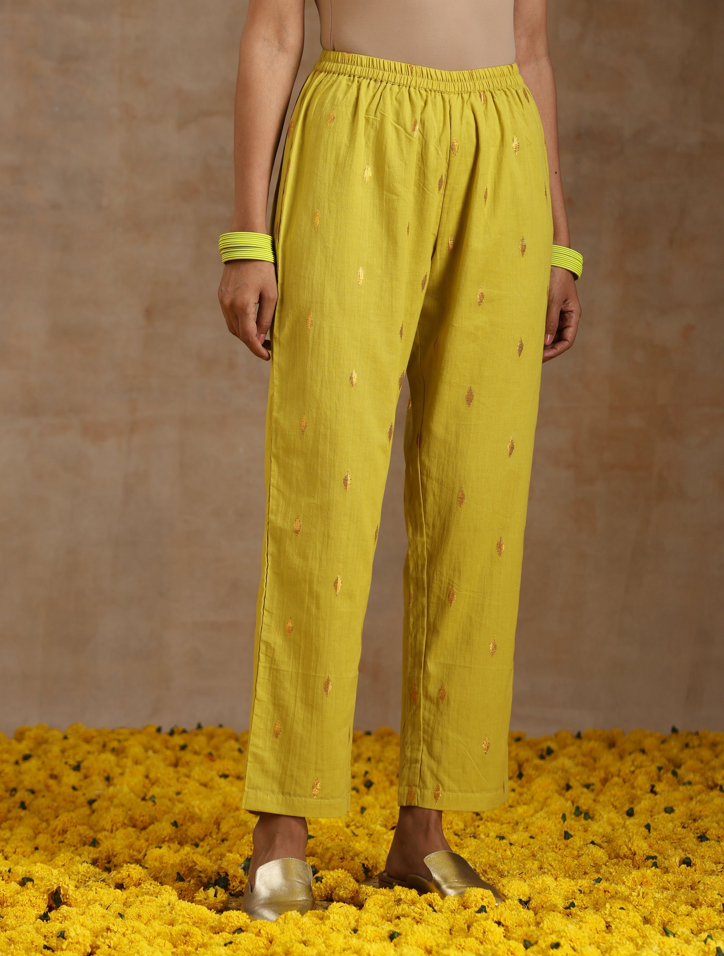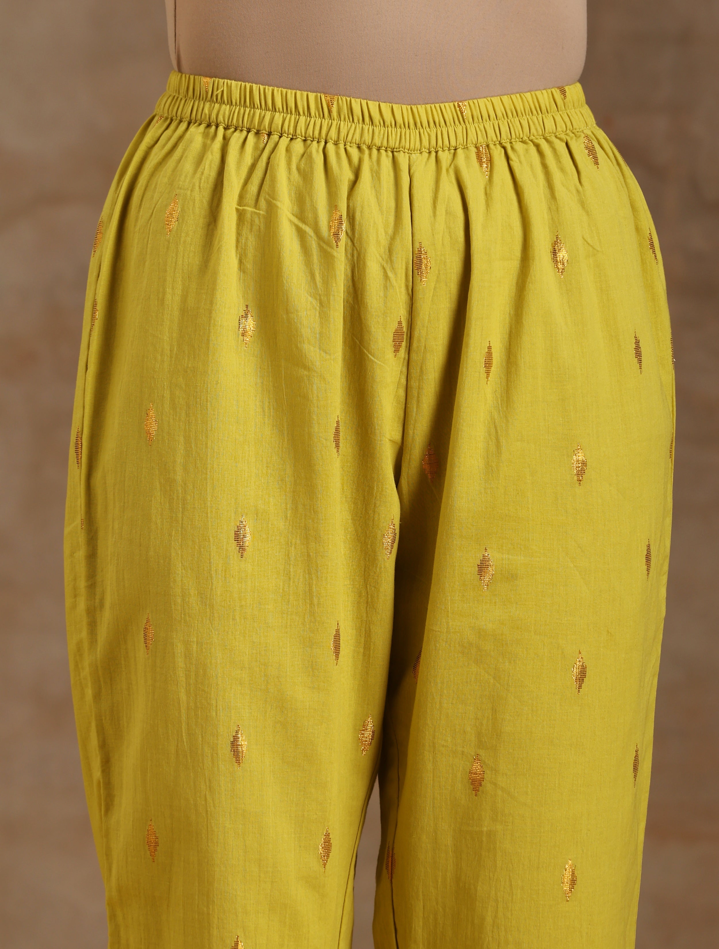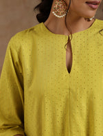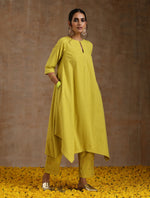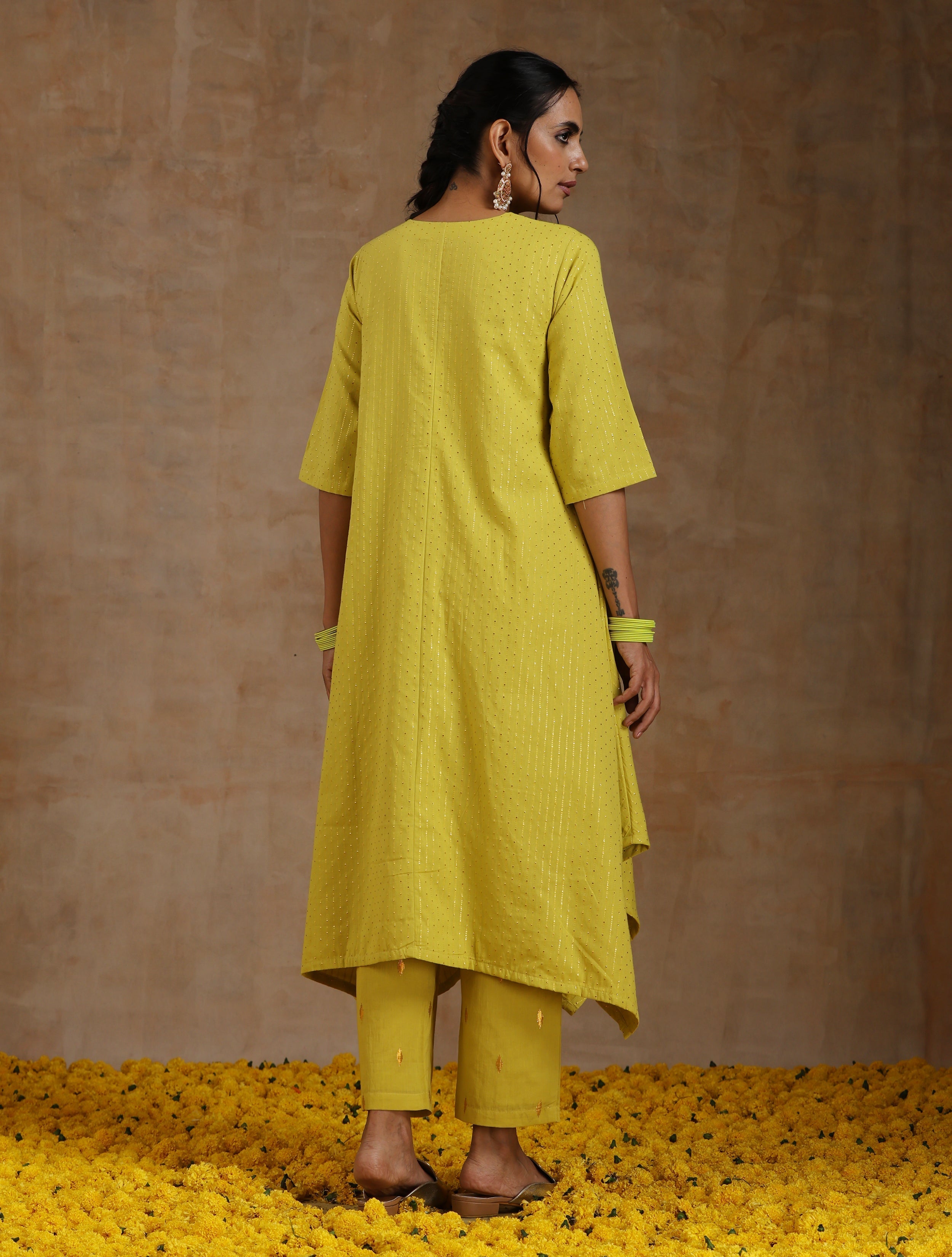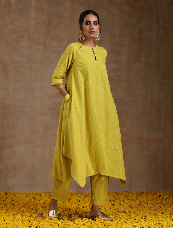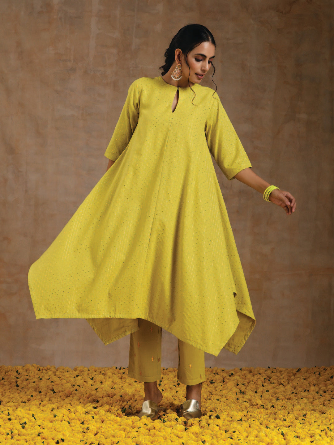 trueBrowns Lime Gold Cotton Handkerchief Kurta SetDescription  Cotton Lurex kurta with keyhole neckline and handkerchief hemline. It comes along wi...
