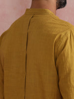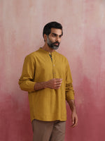 Upgrade your festive wardrobe with this elegant mustard cotton kurta, featuring a classic mandarin collar, mid thigh length and full sleeves.