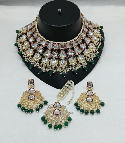 Jewel City Royal Kundan Bridal Jewelry Set - Emerald Green & Crystal Choker with Earrings & Maang Tikka