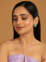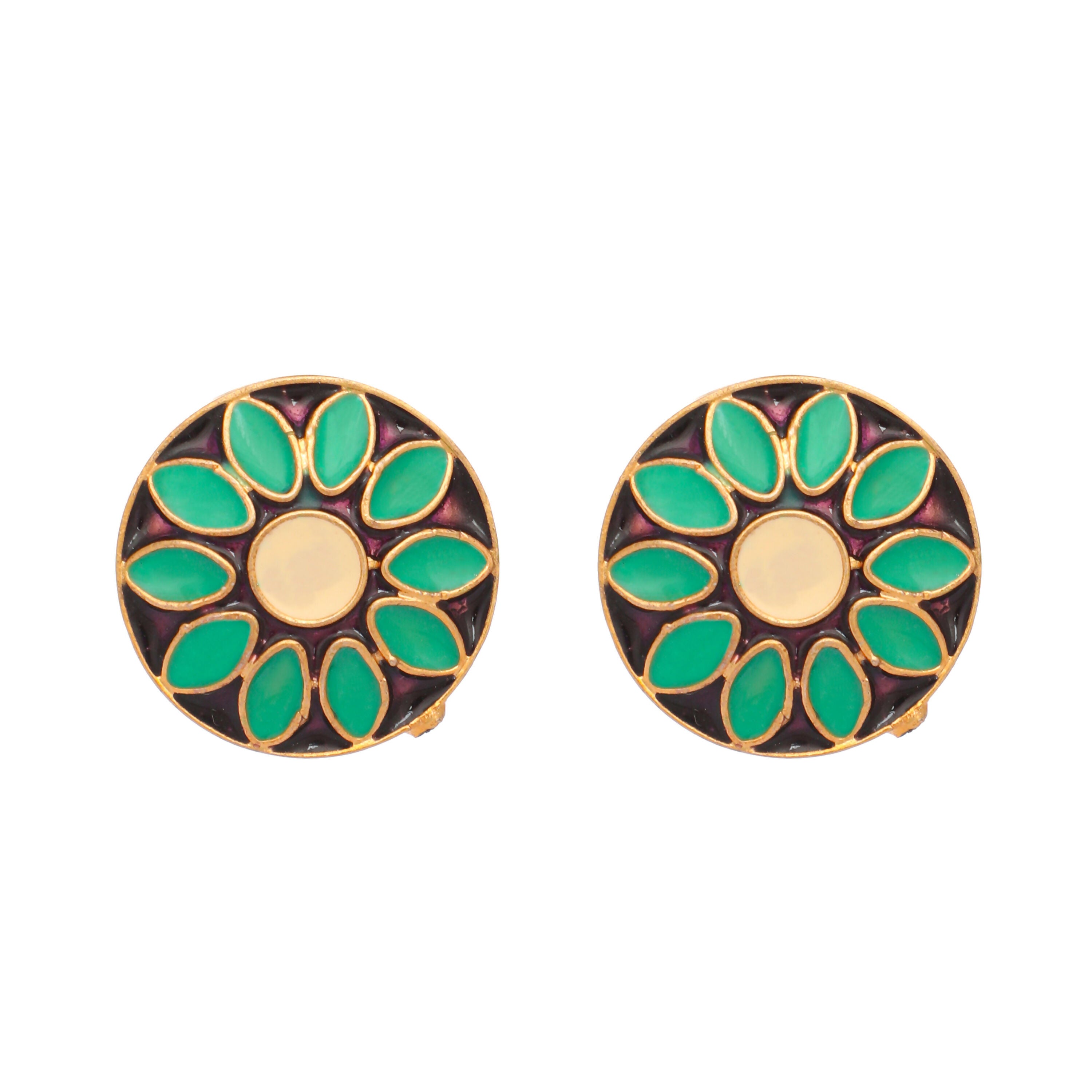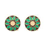 Nuyug 22K Gold Plated Circular Shaped Sea Green Enamelled Floral Motif Studs