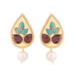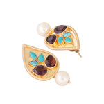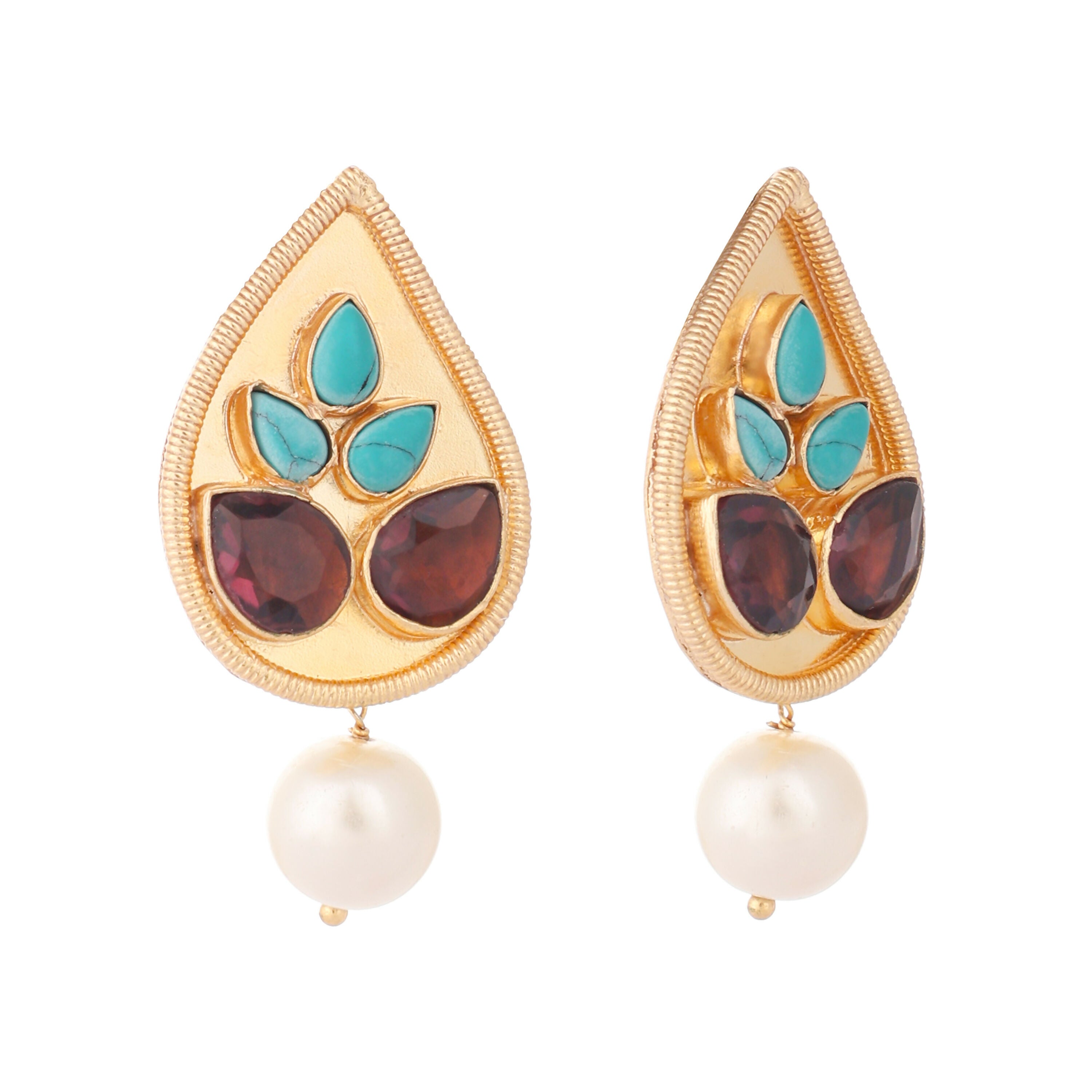 22k gold-plated paisley earrings adorned with turquoise stones and graceful pearl drop. Secured with post and back closure. This comes with, anti-tarnish and hypoallergenic for lasting shine and comfort.
