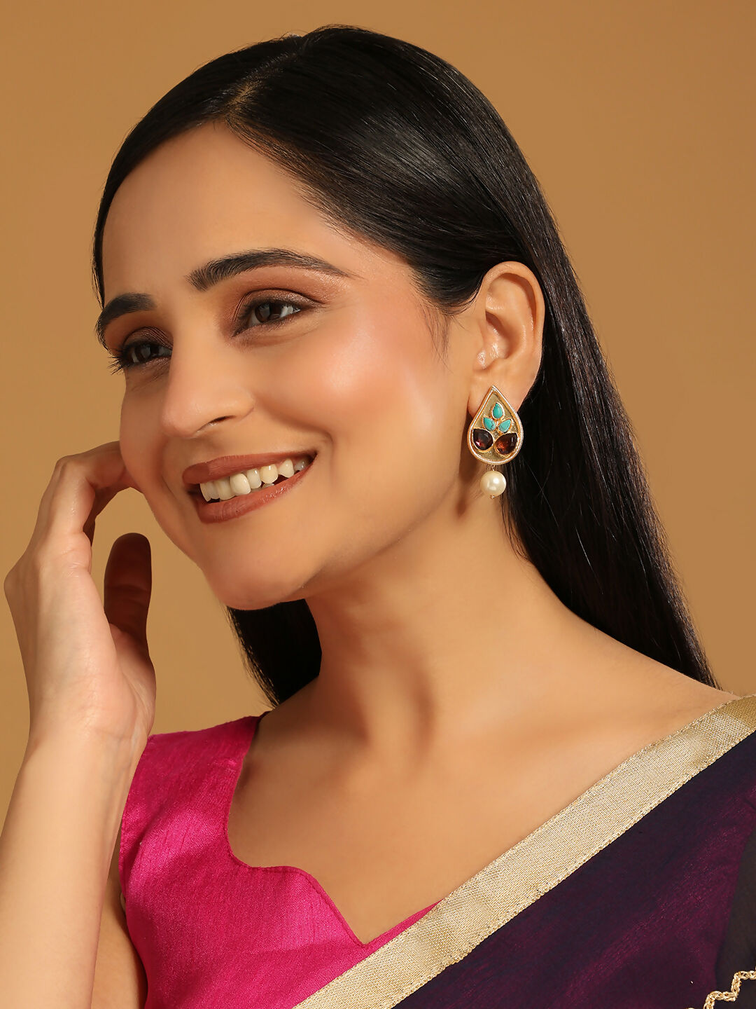 Nuyug 22K Gold Plated Faux Turquoise Stone Studded Contemporary Petal Shaped Pearl Drop Stud EarringsAbout the product:22k gold-plated paisley earr...