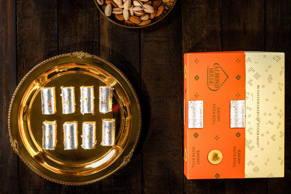 Experience the luxurious melding of almonds and pistachios in our Badam Pista Roll, a creative twist on classic sweets that promises to delight with its rich, nutty flavor profile.