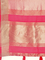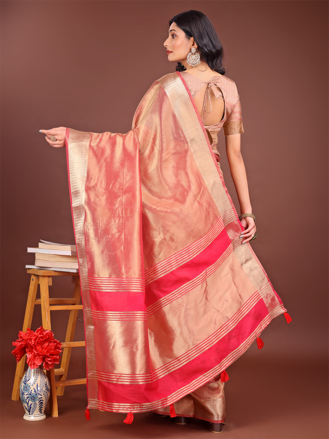 This dual-shade Orange and Pink organza saree exudes timeless elegance with its rich golden zari border and lustrous fabric. The soft transparency of organza is balanced by bold design accents, including a Pink pallu adorned with statement tassels. Whether it’s for a festive celebration, wedding function, or party night, this saree delivers unmatched grace and comfort. Comes with a matching unstitched blouse piece for your perfect custom fit.