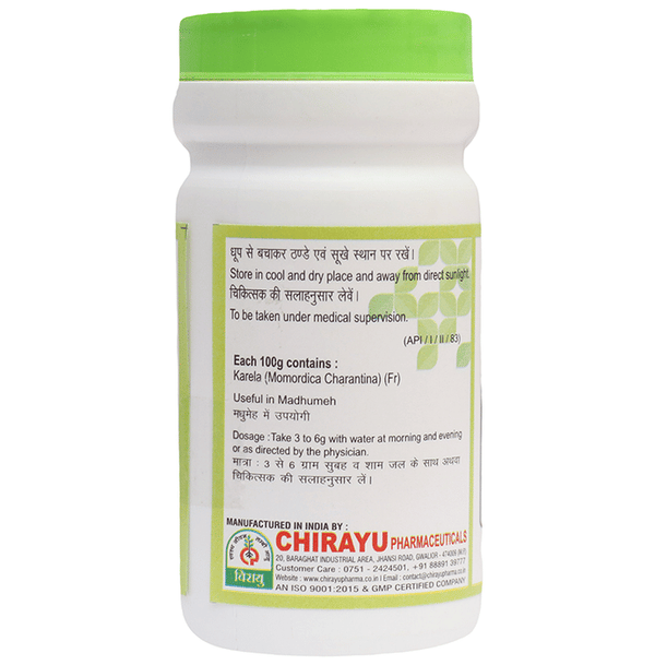 Chirayu Karela Churna a herbal powder blend specially formulated to support overall health and well-being. This Ayurvedic churna combines the unique attributes of Karela and other natural ingredients known for their holistic health properties.