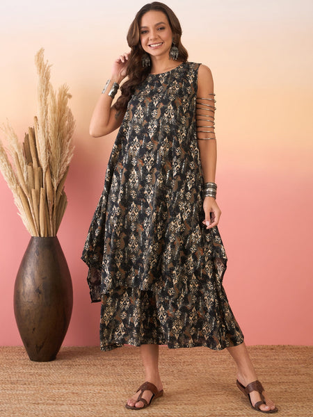 InWeave Black Ikkat Print Foil Round Neck Palazzo Set