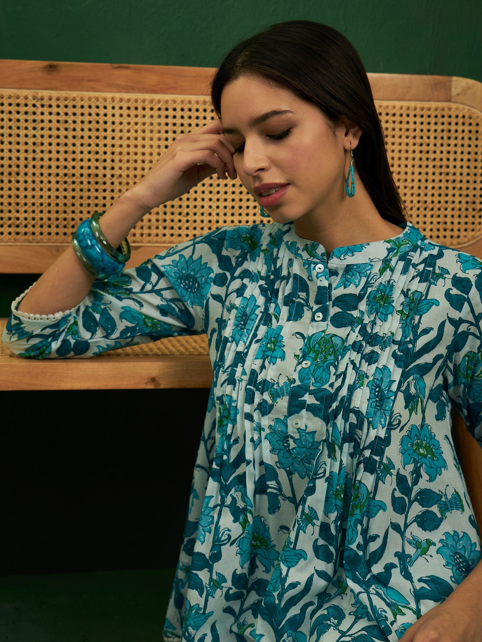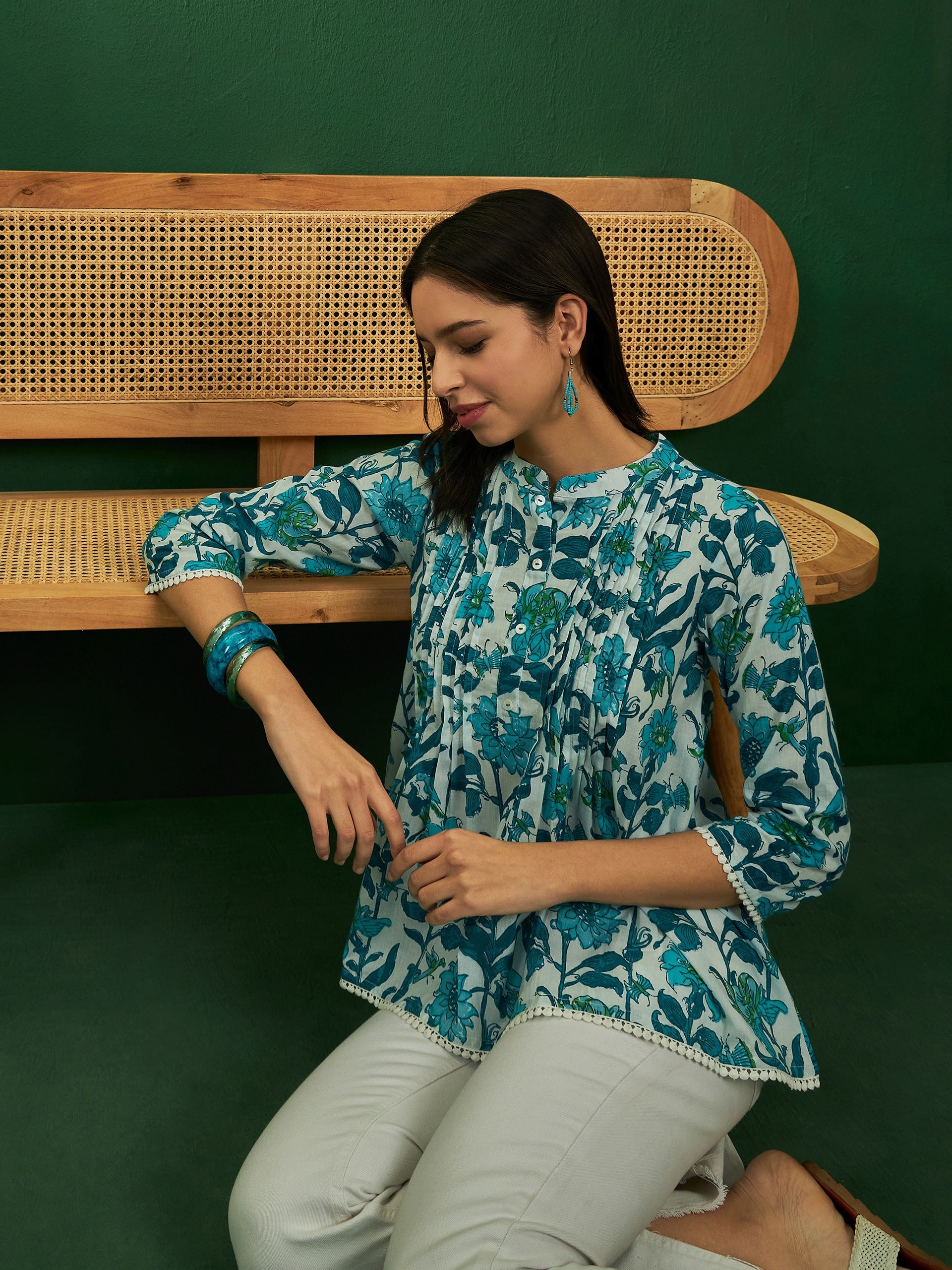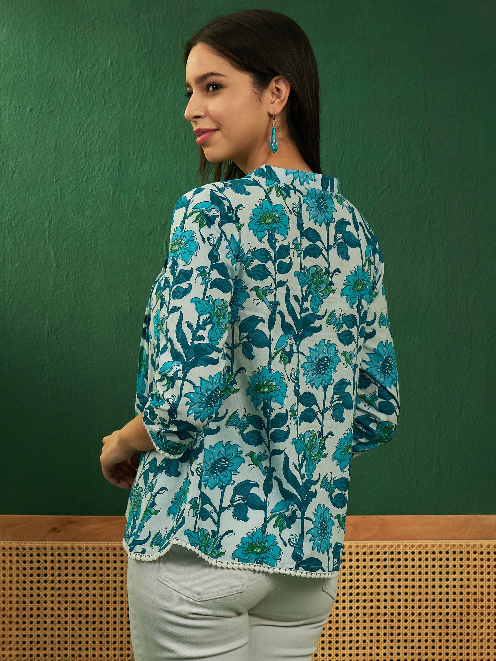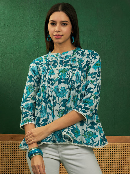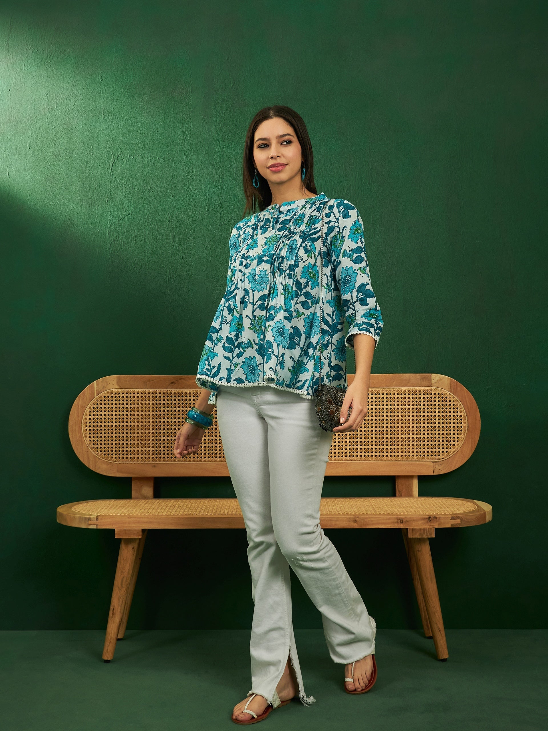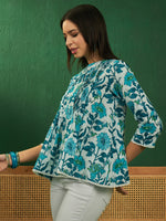 InWeave White Sea Blue Floral Print Front Pintex Lace Top - Distacart