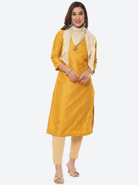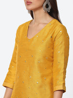 Biba Women Yellow Embellished Mirror Work Straight Fit Art Silk Kurta with Dupatta