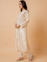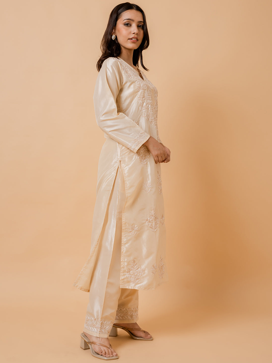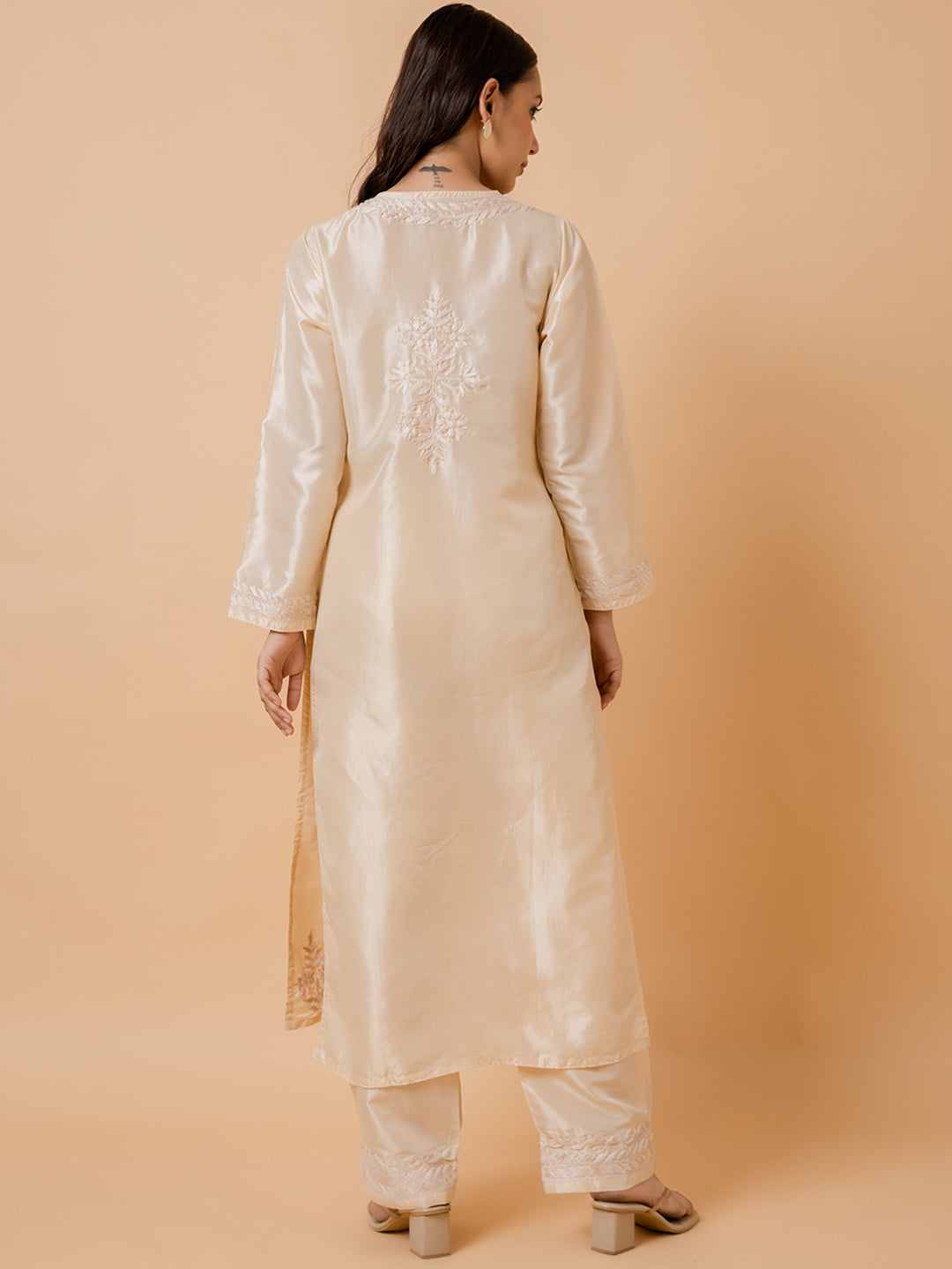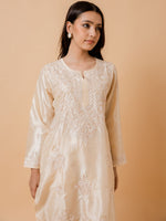 HOUSE OF KARI Floral Embroidered Silk Chikankari Kurta Product Details Colour: beige Floral embroidered Round neck Long, regular sleeves Straig...